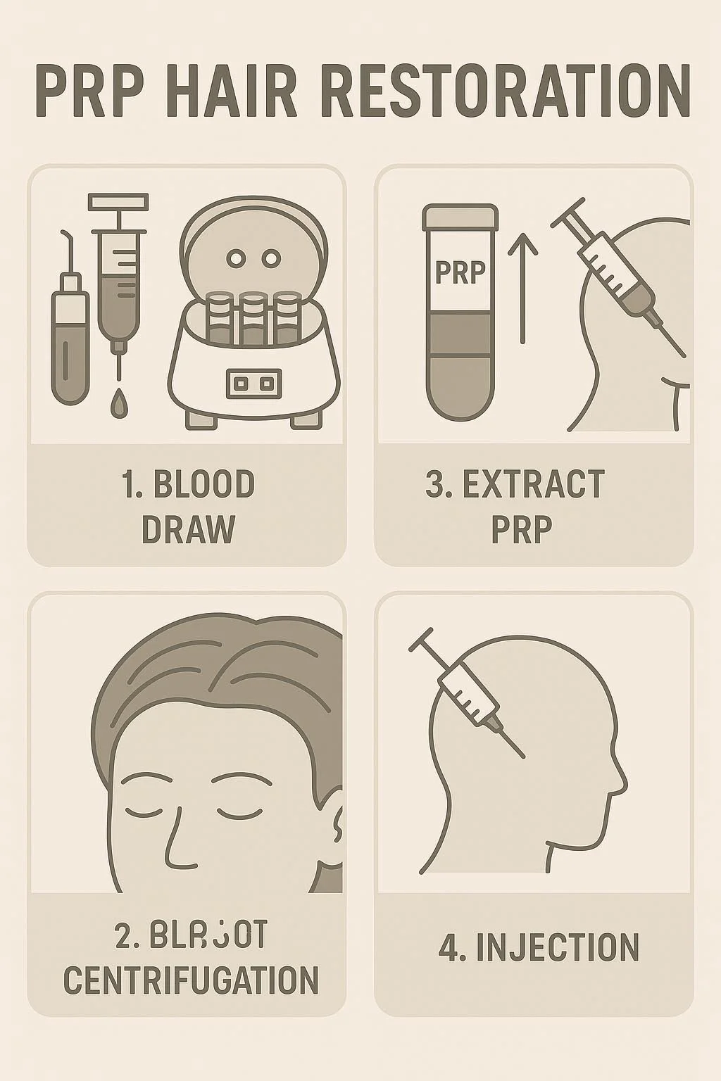 PRP hair restoration is a cutting-edge, non-surgical solution for women and men that taps into your body’s own healing power to fight hair thinning and boost natural regrowth. Using platelet-rich plasma drawn from your own blood, this treatment reactivates dormant hair follicles, enhances scalp health, and stimulates new growth—without drugs, implants, or harsh chemicals. Whether you're just starting to notice thinning or looking to strengthen what you have, PRP offers a safe, natural path to fuller, healthier hair.